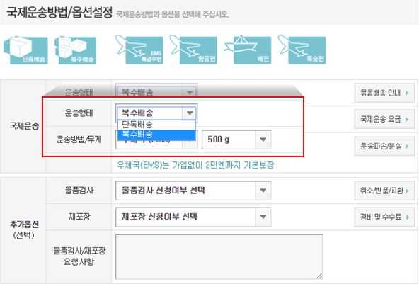 ex) 1~3번 복수 EMS (or 항공, 배편, 특송) 배송으로 구성해 주세요.